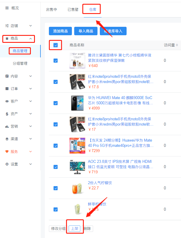 需要商家去“商品----商品管理----倉(cāng)庫(kù)”選擇商品進(jìn)行上架。