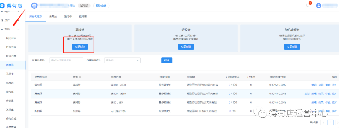 ③設(shè)置營銷玩法:得有店可以實(shí)現(xiàn)商品的預(yù)售、拼團(tuán)、秒殺、分銷、會員卡、積分、優(yōu)惠券、砍價(jià)、限購等30多種功能,點(diǎn)擊立即創(chuàng)建即可發(fā)布活動(dòng)。